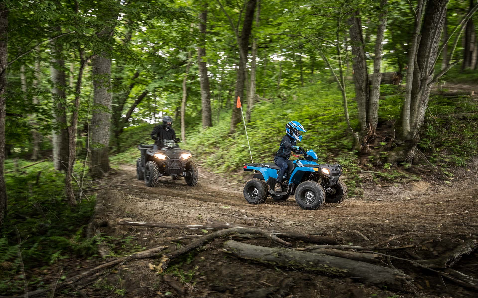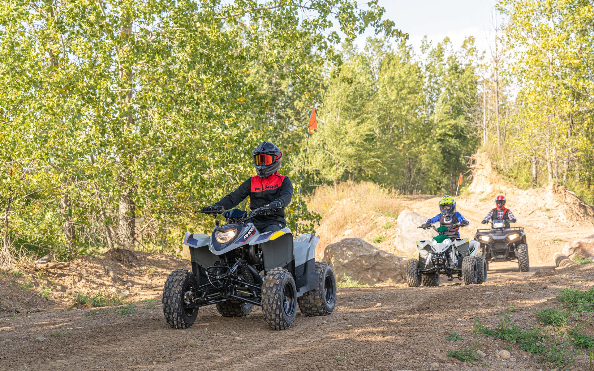 Sportsman 110 je připraven na jízdu včetně kompletní bezpečnostní výbavy zahrnující vytrhávací pojistku, bezpečnostní vlajku, bezplatné online školení a sadu nářadí.